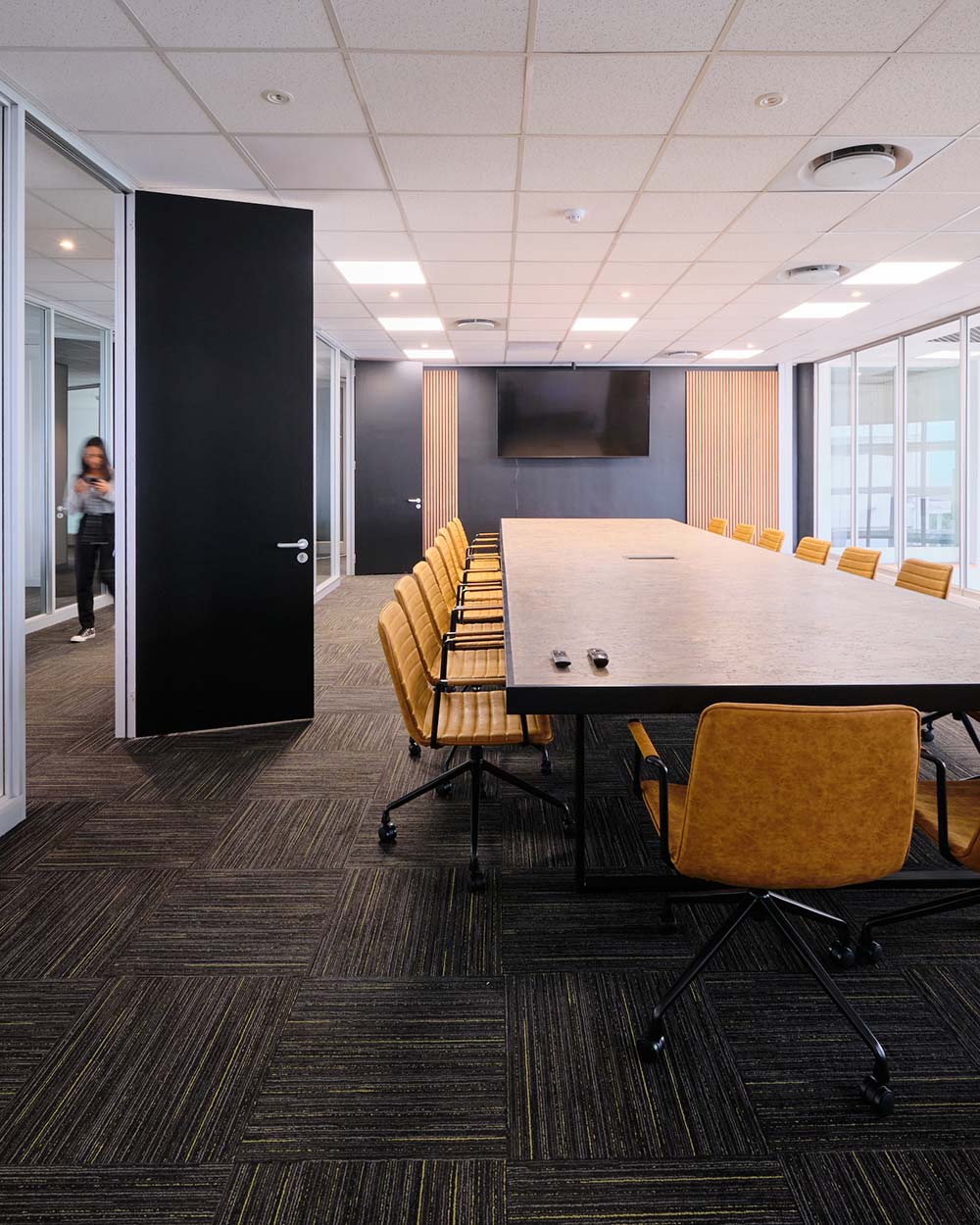 Durable finishes, integrated ceiling systems, and plush underfoot surfaces combine to craft a refined, comfortable working environment.